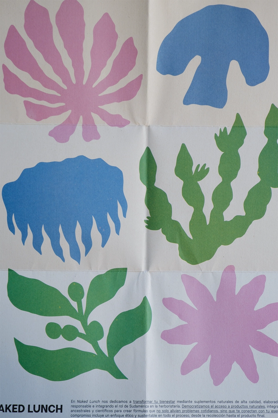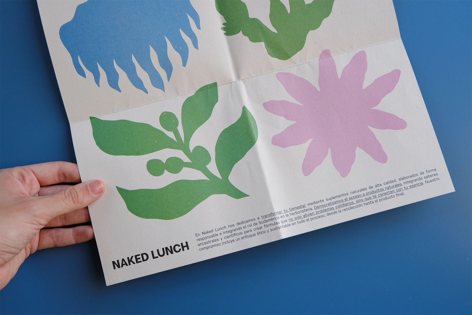As it unfolds, this piece reveals information step by step until, on its final panel, it transforms into an illustrated poster designed to decorate your home. All the illustrations were specially created for the project, reflecting the natural, playful, and transformative spirit of Naked Lunch.