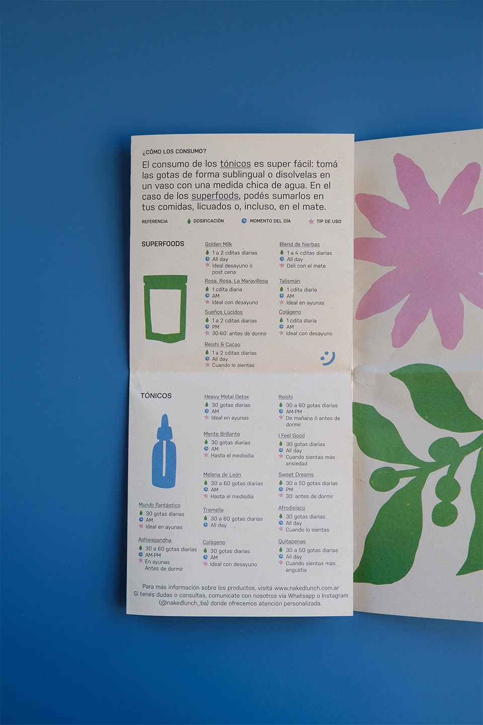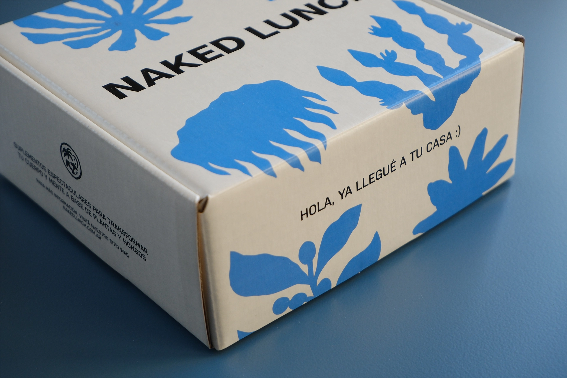 Naked Lunch is a brand of spectacular supplements made from plants and mushrooms, designed to transform body and mind. For this project, we developed the design of all the packaging pieces that accompany the customer experience when receiving their order. The work included designing bags and boxes in various sizes, stickers, and a guide (yes, also spectacular) that tells the story of the brand, its creator, and provides a brief presentation of its products and ways to consume them.
